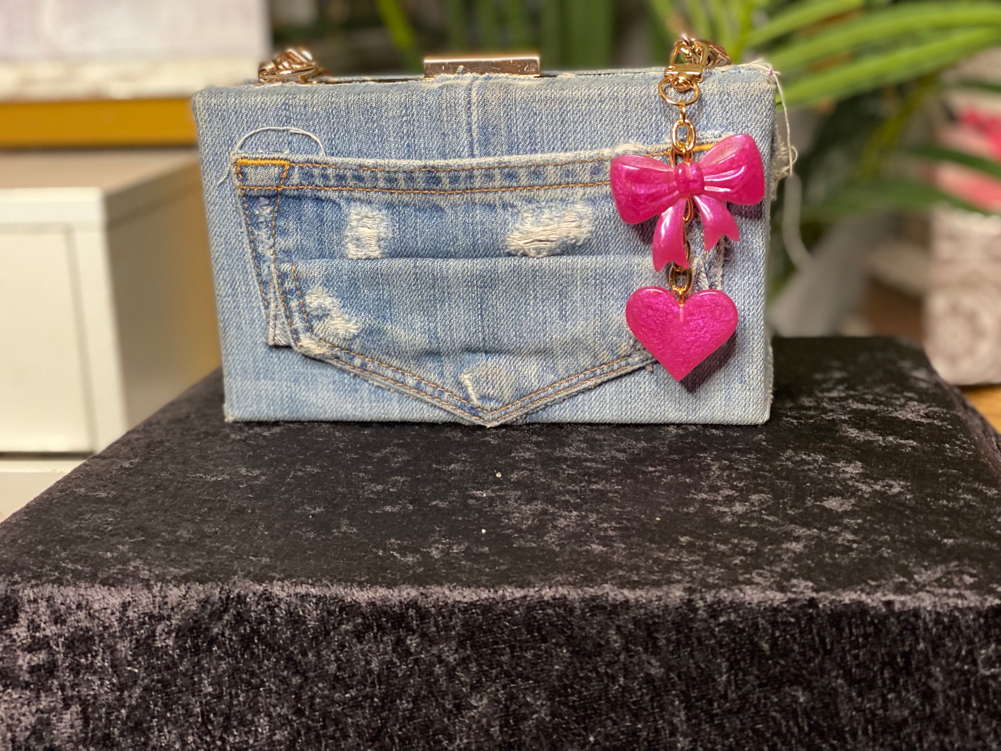 - Handcrafted resin bow & heart charm