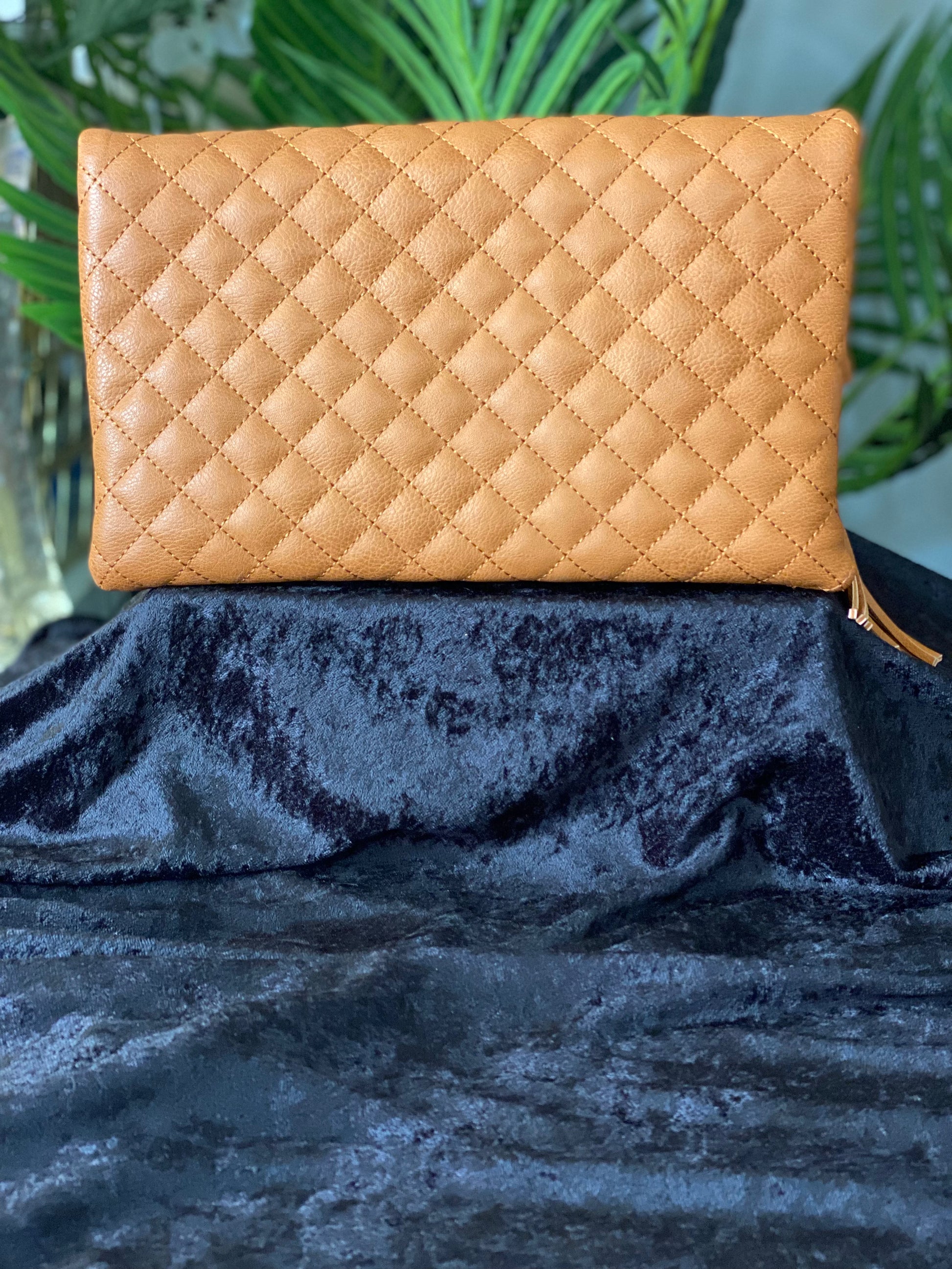 A soft quilted clutch in a warm tan shade with tassel zipper detail. Timeless, lightweight, and ideal for everyday or dressy wear.